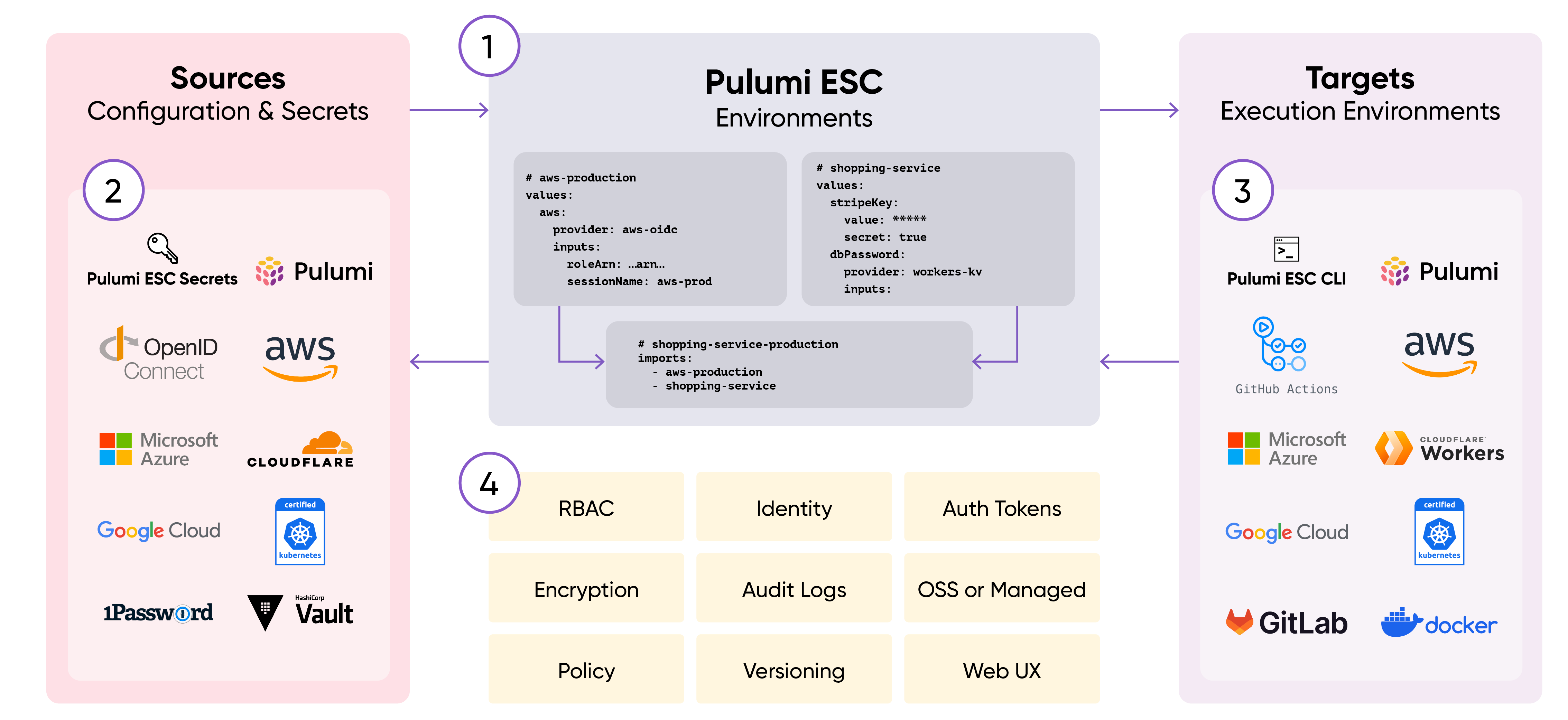 Pulumi ESC enables you to define environments, which contain collections of secrets and configuration. Each environment can be composed from multiple environments.